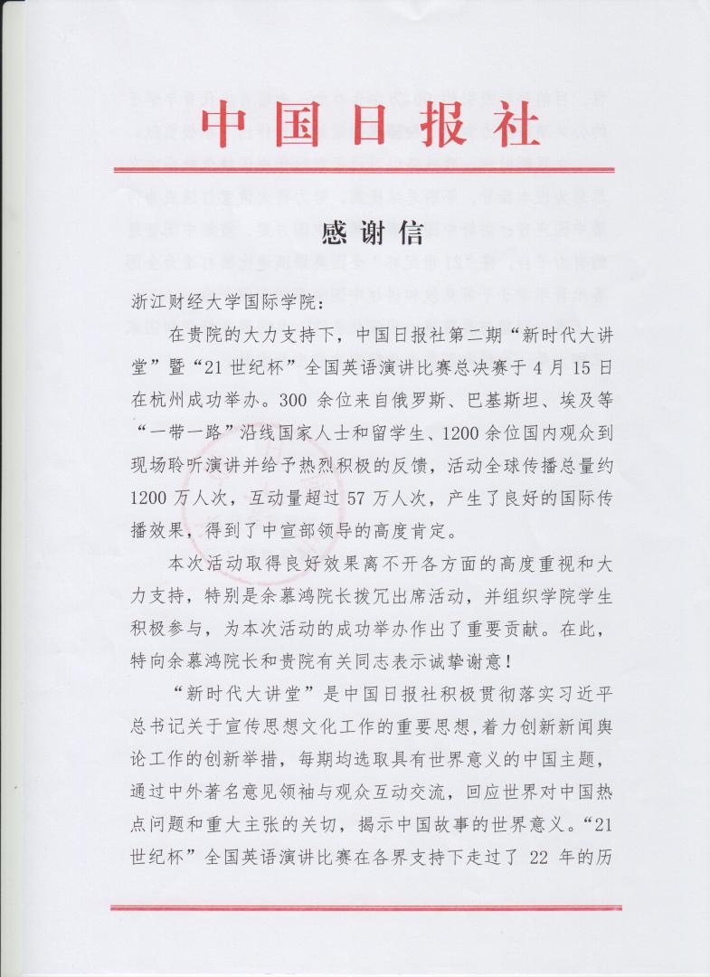 近日,《中国日报》社专程致函我院,对我院师生积极参加主题为“命运共同体 世界新图景”、由该报主办的“新时代大讲堂”暨“21世纪杯”全国英语演讲比赛总决赛颁奖典礼表示感谢。