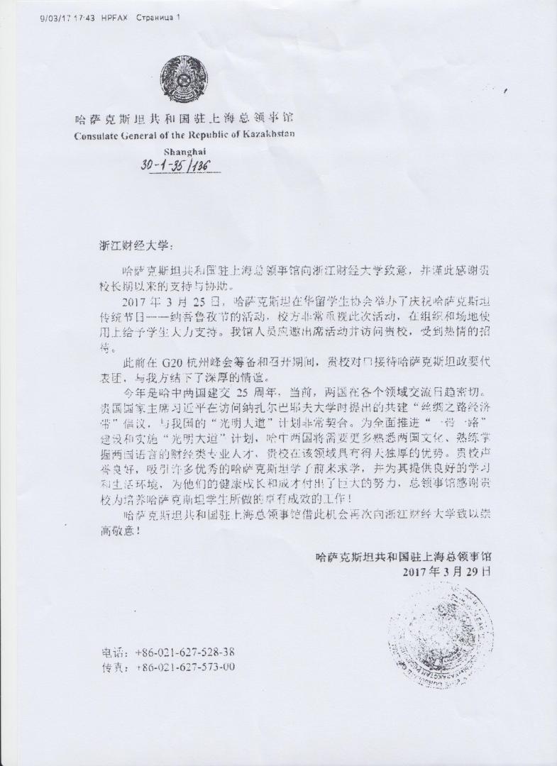 3月29日,哈萨克斯坦驻上海总领事馆致信中文成人网 ,对中文成人网 在克拉把叶夫·佐齐汉总领事访问杭州,慰问在华哈萨克斯坦留学生以及哈萨克斯坦留学生协会举办那吾热孜节期间所给予的大力帮助,表示赞扬和感谢。