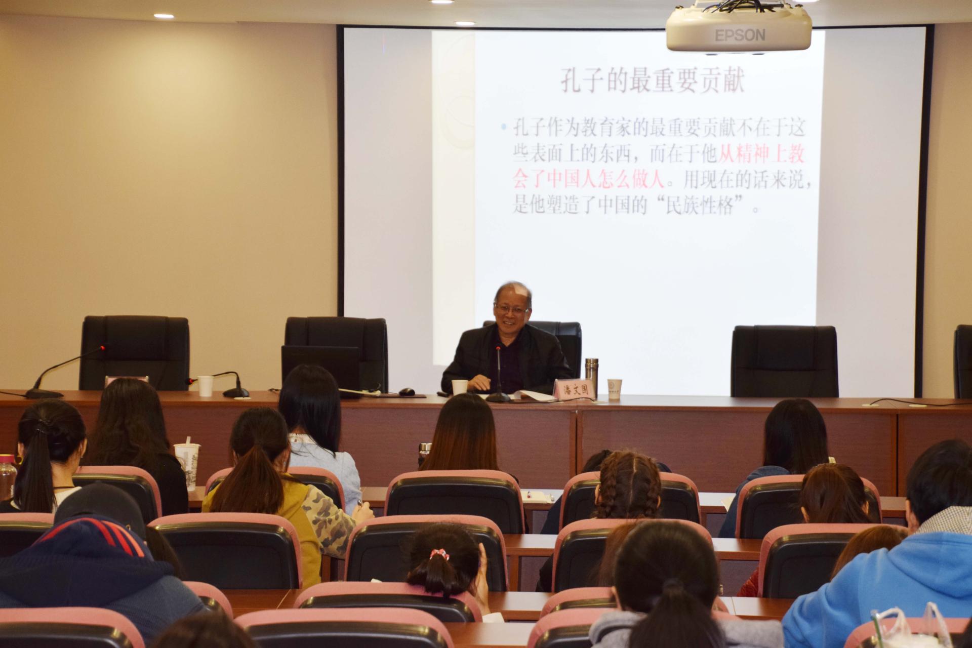 潘文国教授从“教”和“育”两个字出发,系统的解析了中国大教育家孔子对中国教育的贡献,并提出孔子最大的贡献是塑造了中国人的精神。讲座内容深入浅出,参会人员认真学习并就有关问题进行了讨论。最后,余慕鸿教授作了总结发言,在同学们的热烈掌声中,本次讲座圆满落幕。