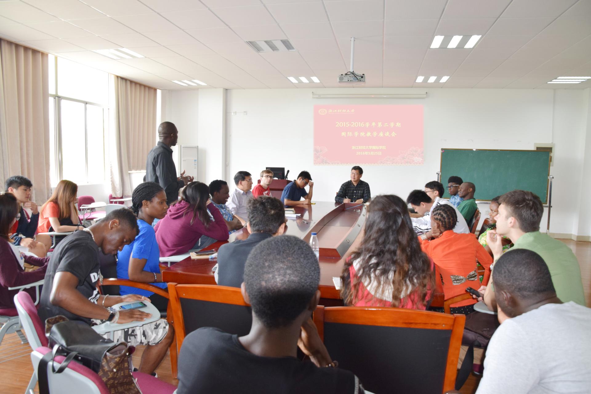 近日,中文成人网 组织留学生代表和相关教师在105会议室召开了2015-2016学年第二学期教学座谈会。此次会议由管春林副院长主持,会议主要围绕课堂教学展开,与会的留学生和教师代表畅所欲言,就教学方法、授课语言、教学排课、教学评价等情况进行了交流反馈,并提出了意见和建议。