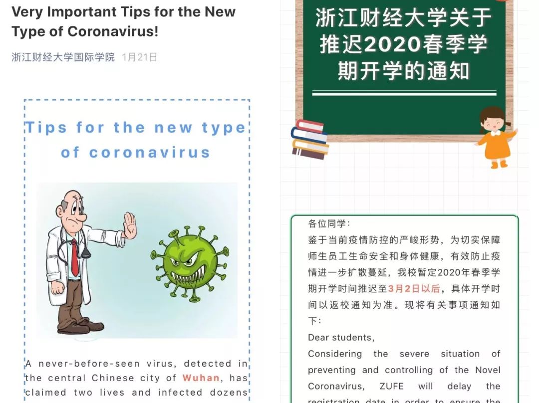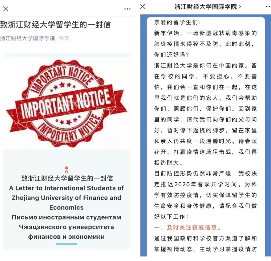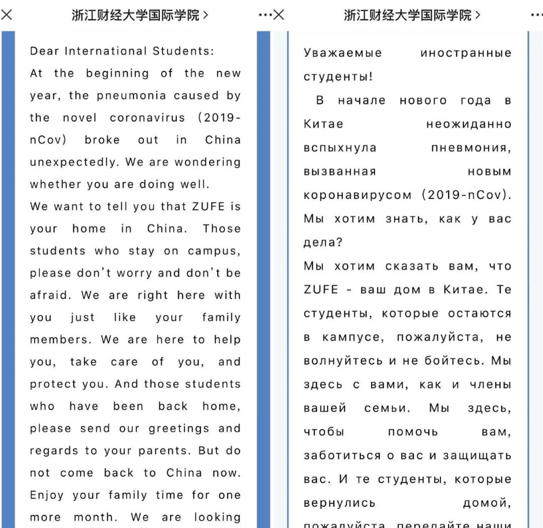 给留学生们写了一封热情温暖的长信,为了让每位学生都清楚了解新型冠状病毒感染肺炎疫情动态,以及学校近期工作安排,老师们准备了中英俄3种语言。留学生为梦想千里行,来到中国,来到浙财,此时此刻,学校对他们的关心和关爱牵动着每一位留学生的心。