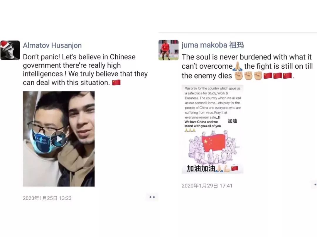 老师对留学生们深切的关爱。看到夜以继日奋战的医务人员、不辞辛劳的各战线工作者、和送温暖的老师们,留学生们都对中国和中国人民战胜疫情充满信心。他们一起为中国祈祷,加油中国,我们和你在一起!