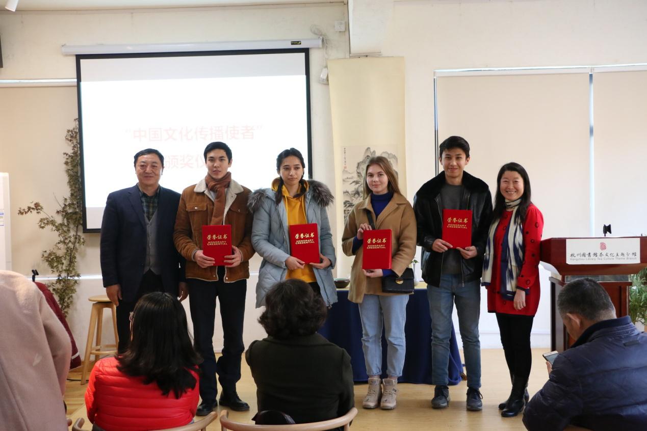 出席活动的四位留学生颁发了“中国文化传播友好使者”证书,鼓励留学生积极传播中华文化,为共建人类命运共同体做出贡献。