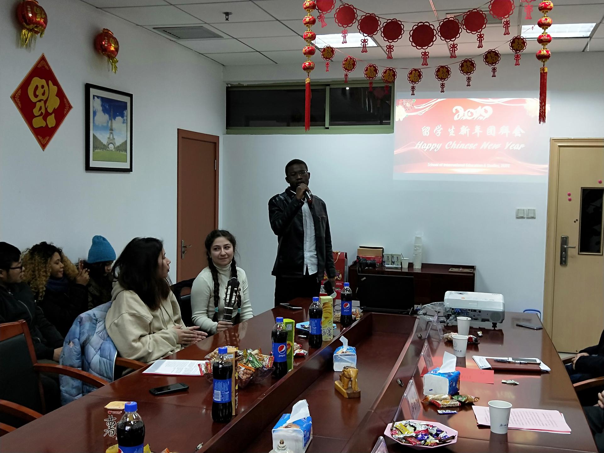师生在会议室济济一堂,2019年留学生新春团拜会在此举行。李占荣副校长出席团拜会,慰问寒假留校的留学生,并送上了新春的祝福,衷心祝愿他们在学校度过一个难忘的中国春节。