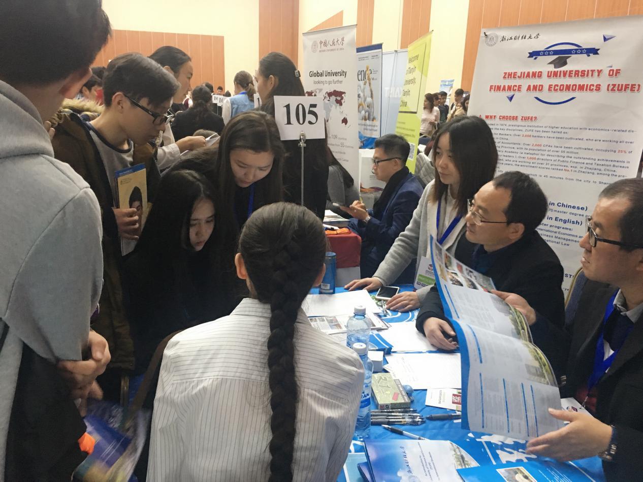、金融学院、经济学院、外国语学院派代表参加了此次教育展。本次共有来自中国大陆和香港地区的41所中方高校参展,数量为历年之最。除首都阿斯塔纳外,中文成人网