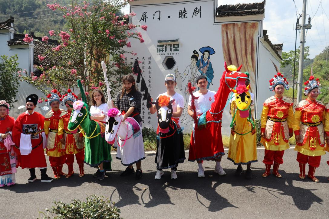 淳安县屏门乡是浙江省著名的“睦剧之乡”,为了深入体验淳安睦剧文化,留学生们亲身体验了竹马舞,还与当地的小朋友们一起学习了睦剧《南山种麦》片段。《南山种麦》讲述了夫妻二人一路唱着山歌小调到田间地头种麦的故事,独特的唱腔、淳朴的风格和通俗的台词,充分展现出淳安浓郁的乡土气息和人文风情。留学生们两两搭档,展示学习成果,赢得观众的阵阵笑声与掌声。学习的最后,来自俄罗斯的学生海琳表示,希望今后有机会能多来屏门乡,学好睦剧,并向世界传播睦剧文化。