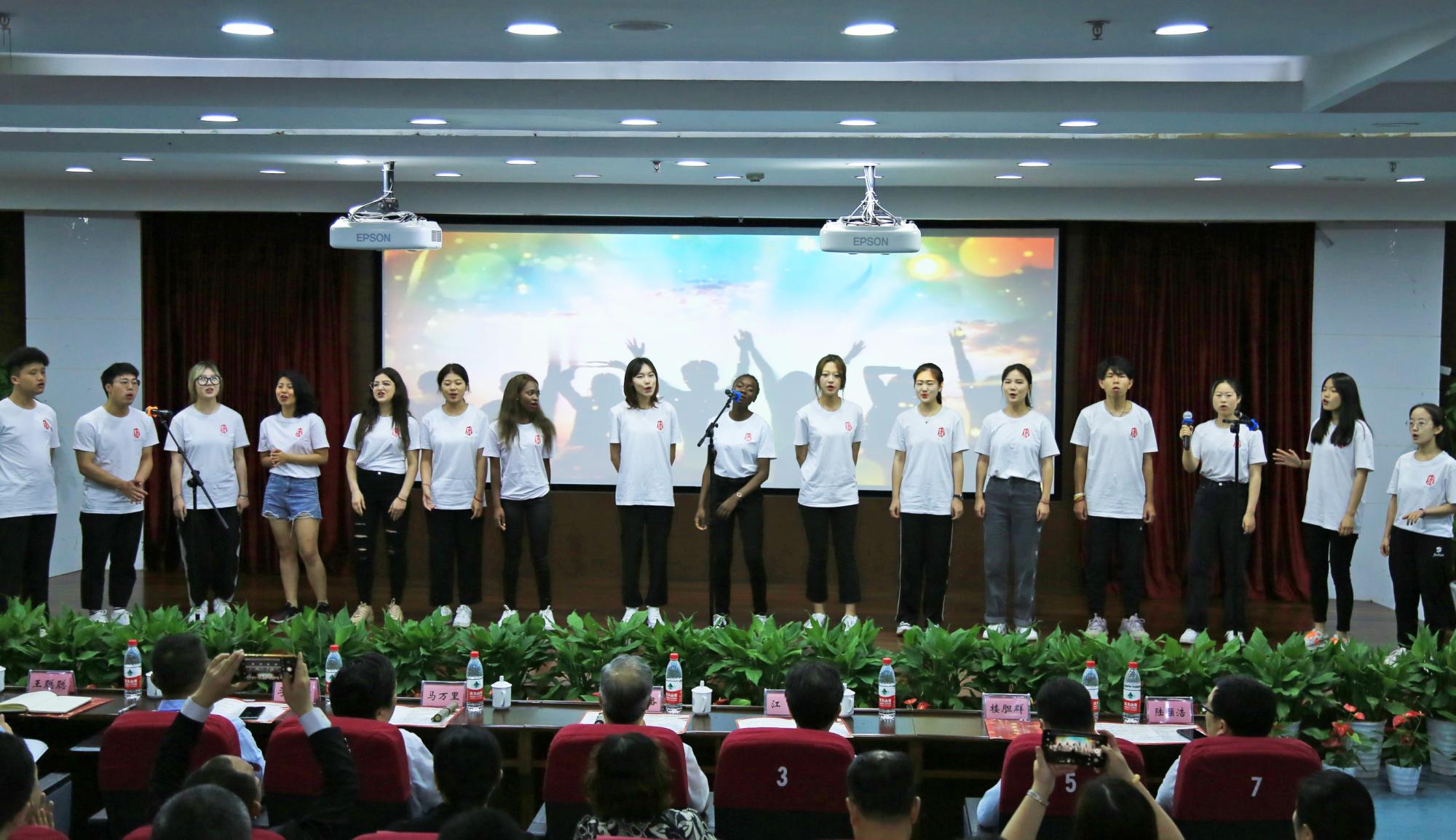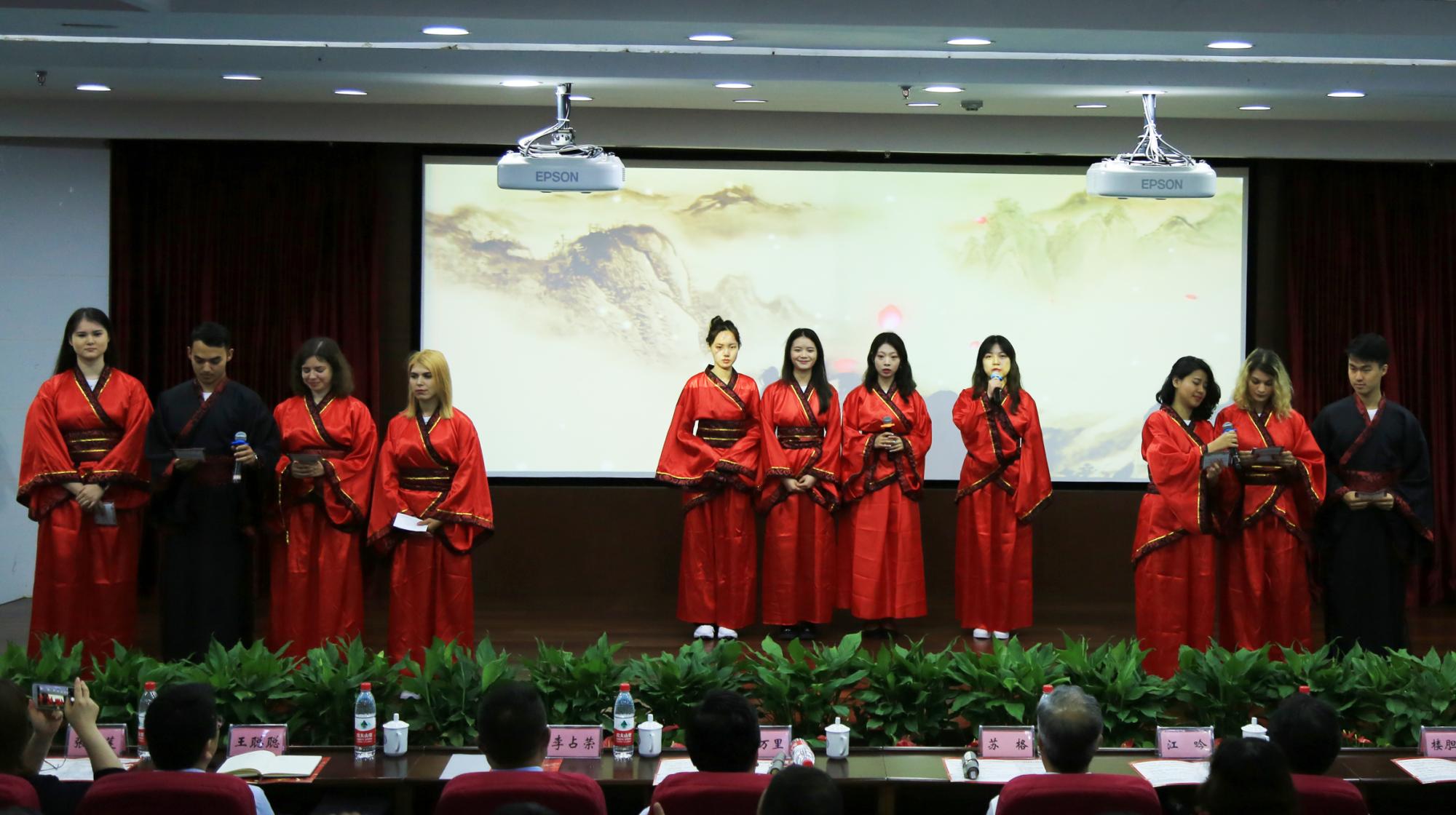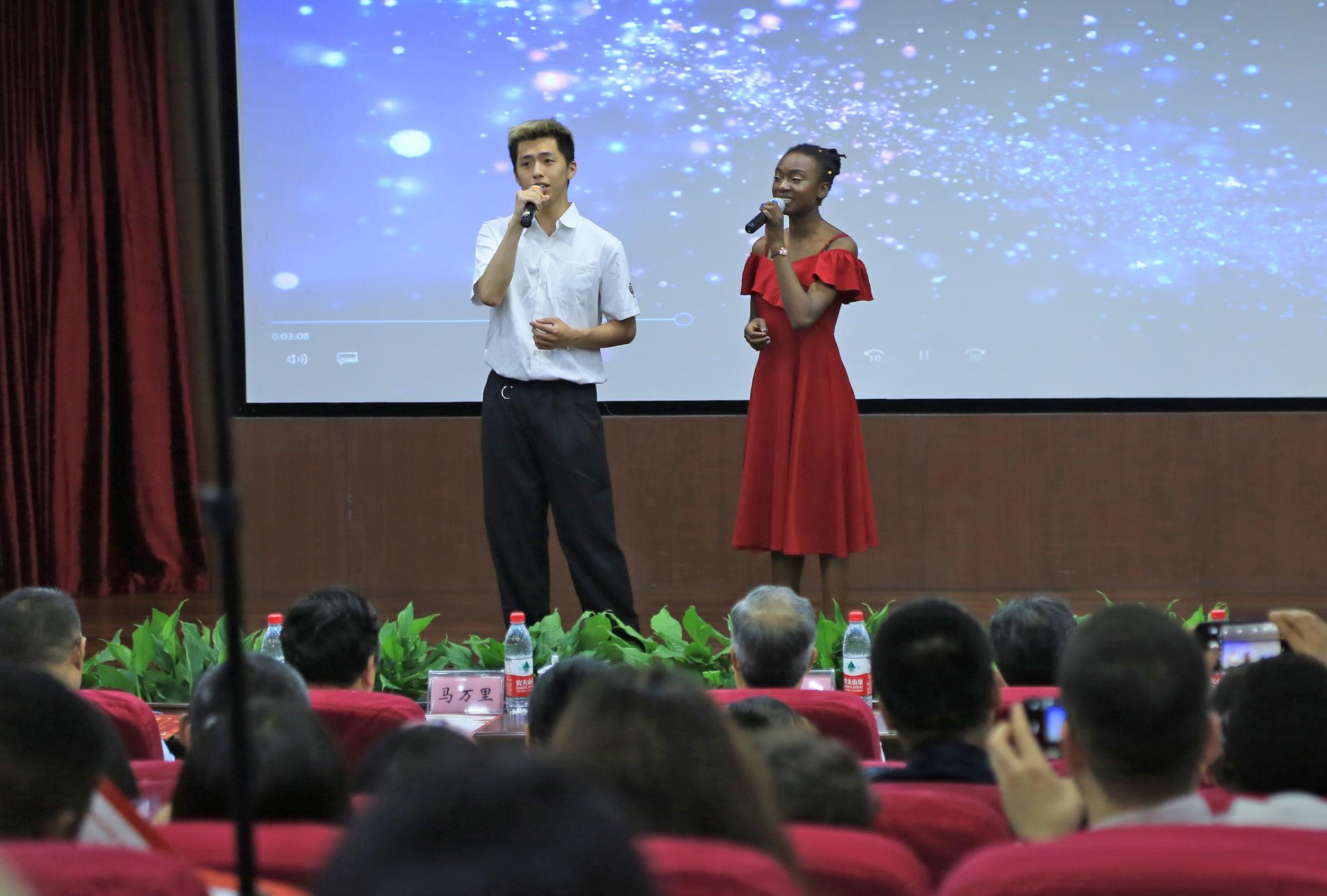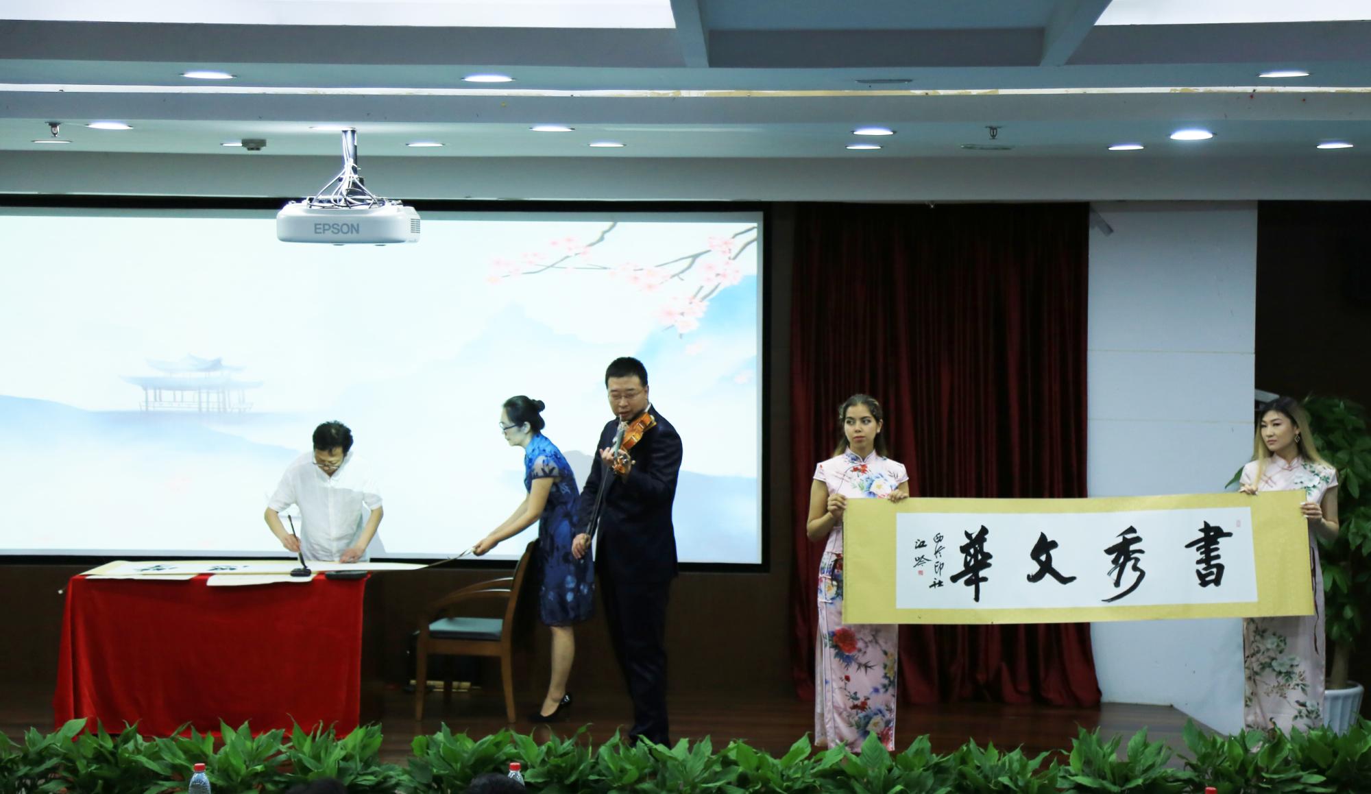 开幕式里,来自世界各国的留学生与中国学生一起,为观众带来了精彩的文艺表演,迎来台下阵阵掌声。校艺术团表演的民族舞蹈《帕米尔之情》热情奔放,校十佳歌手NYAMBE TASHA NATASHA与同伴带来的情歌对唱《因为爱情》婉转悠扬,毋丹老师演唱的越剧选段《西湖山水还依旧》余音缭绕,中外学生共同带来的诗歌朗诵气势磅礴。《妙笔琴韵》中,中国书法、古筝以及小提琴相互配合,别有韵味。在中外学生热情洋溢的合唱《相亲相爱》中,开幕式落下帷幕。