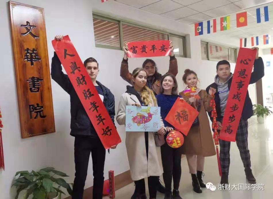On the morning of February 10th, international students from Zhejiang University of Finance and Economics recited "The Rhyme of Li Weng" at Wenhua Academy to celebrate the Chinese New Year. The international students gathered together with joy to experience the traditional Chinese New Year culture. All the international students showed their unique skills, such as calligraphy, paper cutting, drawing New Year pictures, making lanterns, making dumplings and sticking Spring Festival couplets.