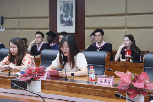 毕业生辅导员陈思涵作为辅导员代表发言,她首先祝贺毕业生们圆满完成学业、顺利毕业,希望所有毕业生今后仍然保持对知识的渴求,坚守自己的理想和追求,以积极的态度面对人生,不断实践和努力探索,勇于承担起新时代青年的重任,推动不同文化之间的沟通和交流。