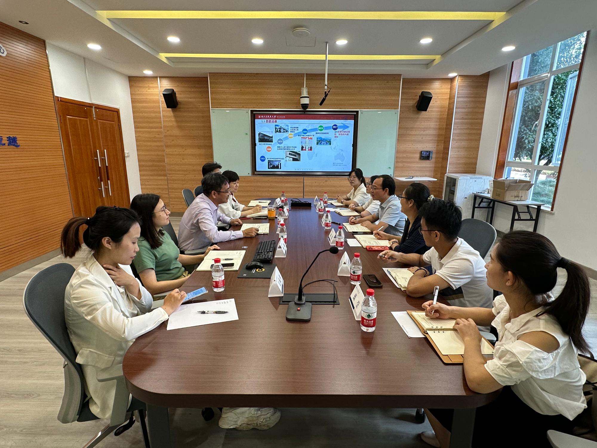 上午,我院调研人员一行来到浙江中医药大学国际教育学院,受到浙江中医药大学国际教育学院院长董敏华、副院长万朵和相关处室工作人员的热情接待。首先,董敏华院长就浙江中医药大学办学历史、国际化工作机制体制、来华留学生培养、办学成效做了简要介绍。然后,万朵副院长就来华留学生高等教育质量认证工作的开展情况做了详细介绍。会上,双方就留学生培养、校友工作、管理机制和来华留学生高等教育质量认证等方面进行充分交流。
