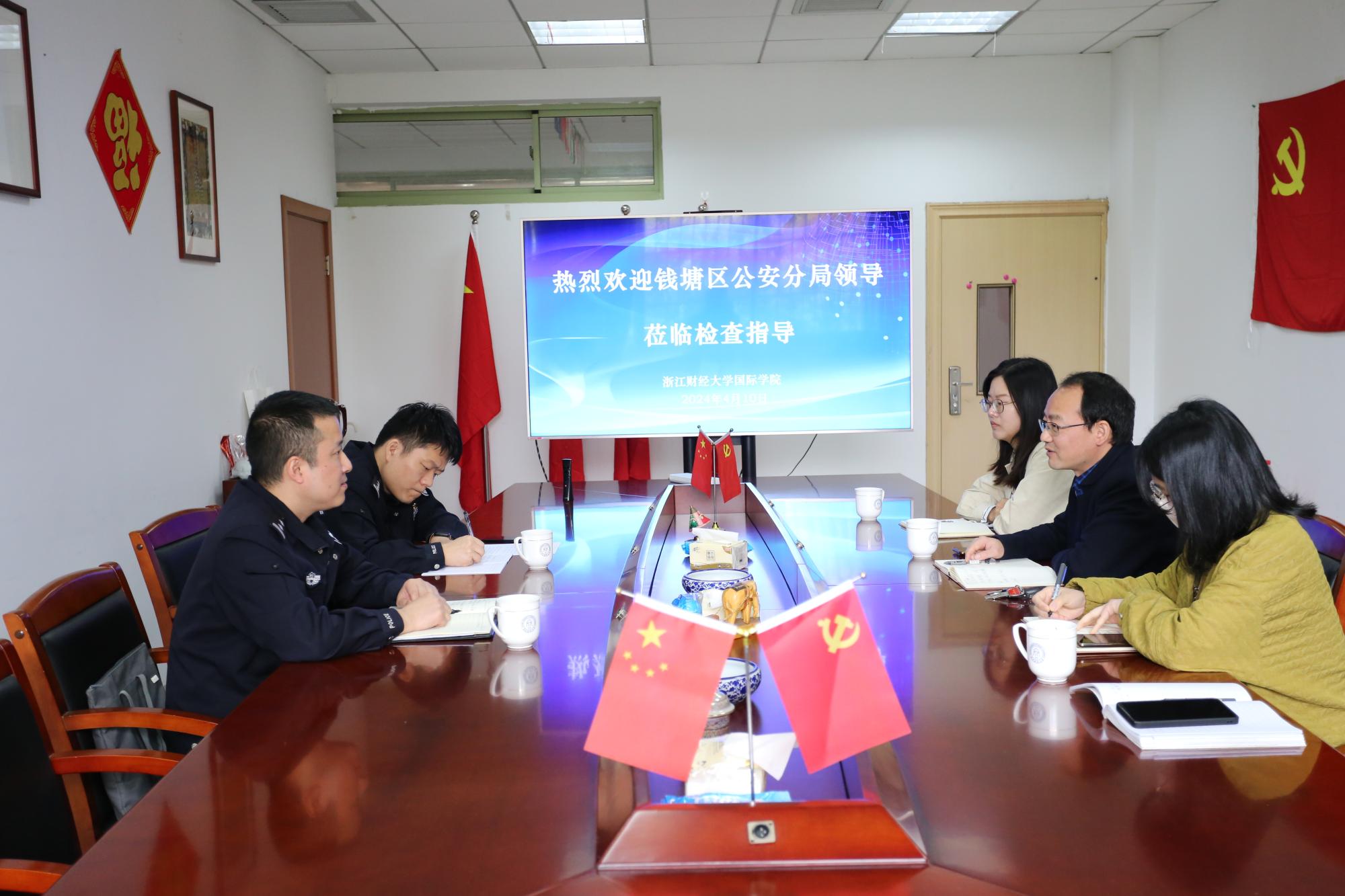 4月10日上午,钱塘区公安局副局长潘亮亮与钱塘区出入境管理大队大队长张杨一行莅临我院调研指导,院长柴志贤和留学生辅导员参加了此次会议。