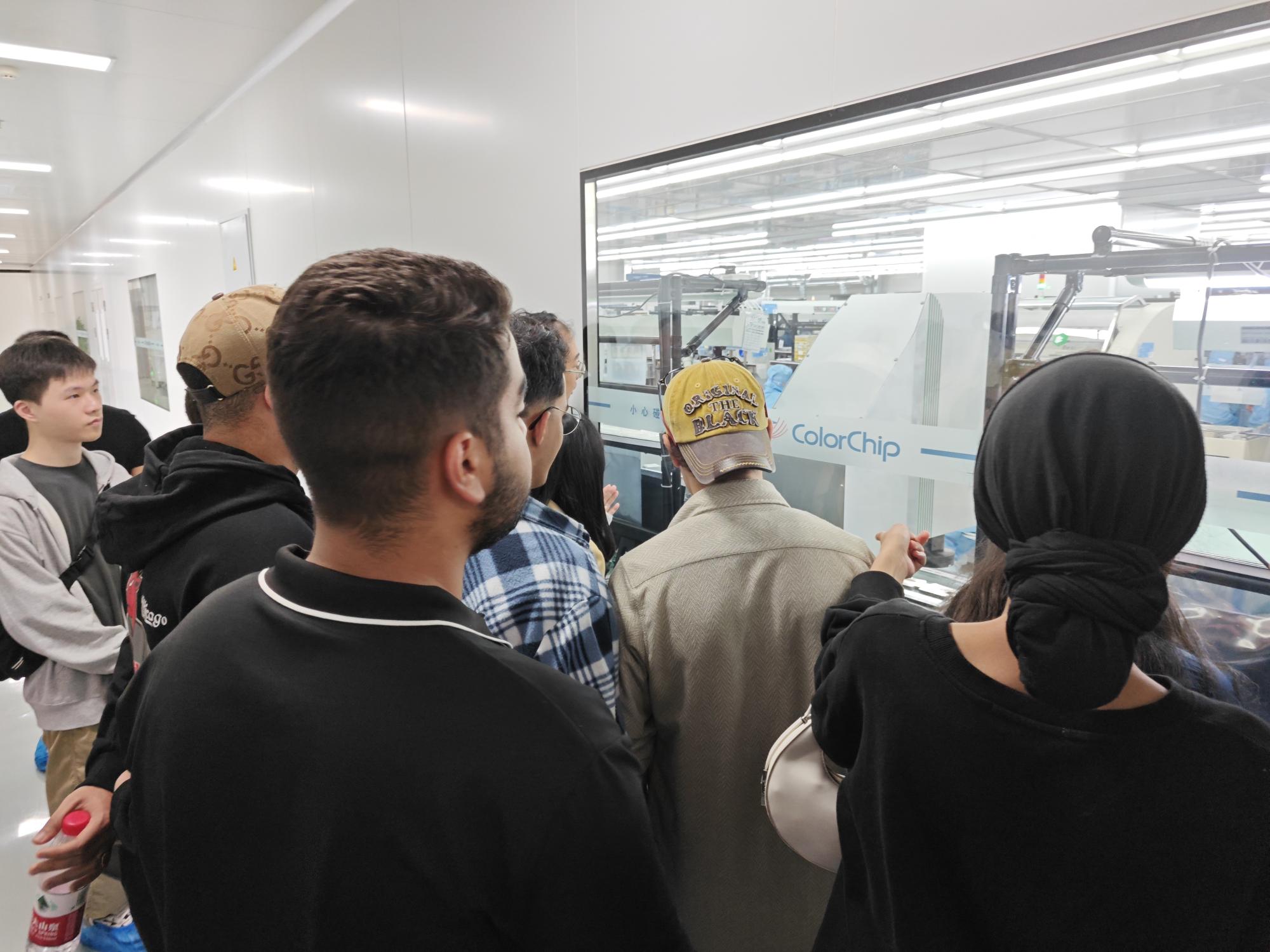 工作车间,工人们熟练地操作着精密设备,一片片微小的芯片在流水线上迅速完成从原材料到成品的转变。每一颗芯片都是科技与智慧结晶,先进的中国制造,现代的企业管理深深感染着留学生们。
