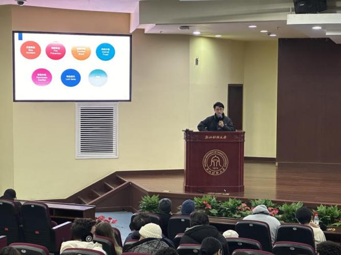 辅导员汪博林结合近两个学期实际发生的案例,从交通、消防、网络诈骗、酗酒冲突以及人身财产安全等方面,为留学生们进行了深入的安全警示教育,以鲜活的事例敲响安全警钟。此外会议还邀请留学生 KHYAM HIBA分享了自己的交通事故经历,以亲身经历向同学们着重强调了严格遵守交通规则、高度重视交通安全的重要性与必要性。