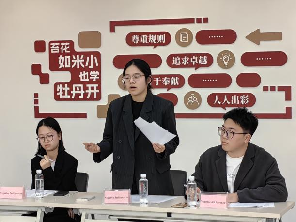 学生出色的思辨能力与参与热情。随着辩论比赛临近尾声,四位中外评委老师Jack Miles Oakley,Luigi Azzaro,王建国,高友江对整场赛事进行了精彩点评。评委Jack特别提到,同学们在语言表达和跨文化交流中展现了扎实功底和良好的思辨能力,充分体现了国际化教育的成果。