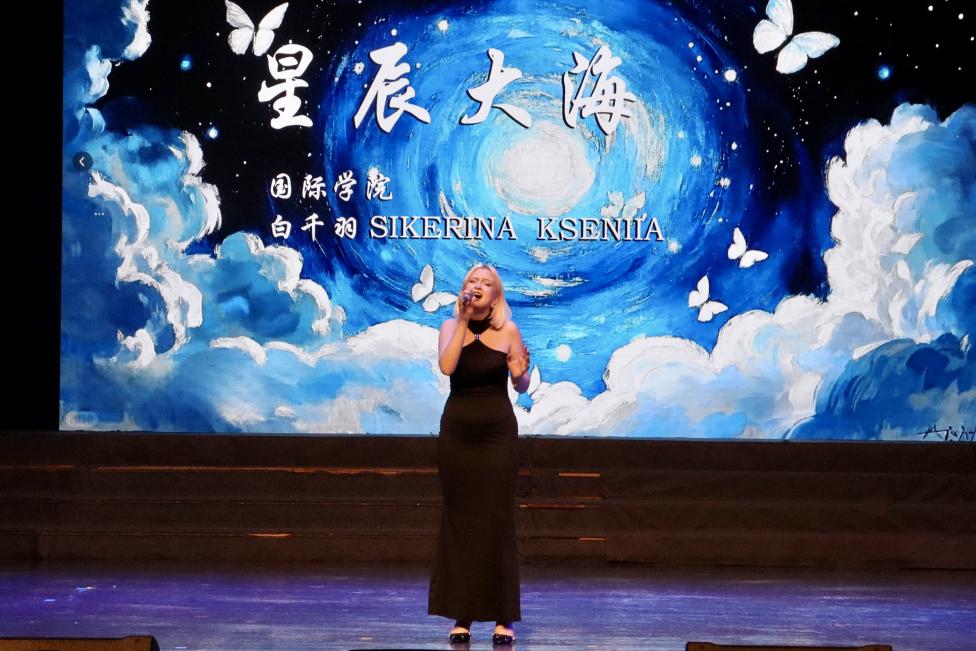5月11日晚,金融学院“融华盛锦时”2025届毕业生晚会于普华大剧院顺利举行,我院留学生受邀参加。俄罗斯籍留学生欧黛玉,演唱了一首《夜空中最亮的星》。她的歌声悠扬动听,仿佛将观众带入了璀璨的星空之下,赢得了现场师生的热烈掌声。