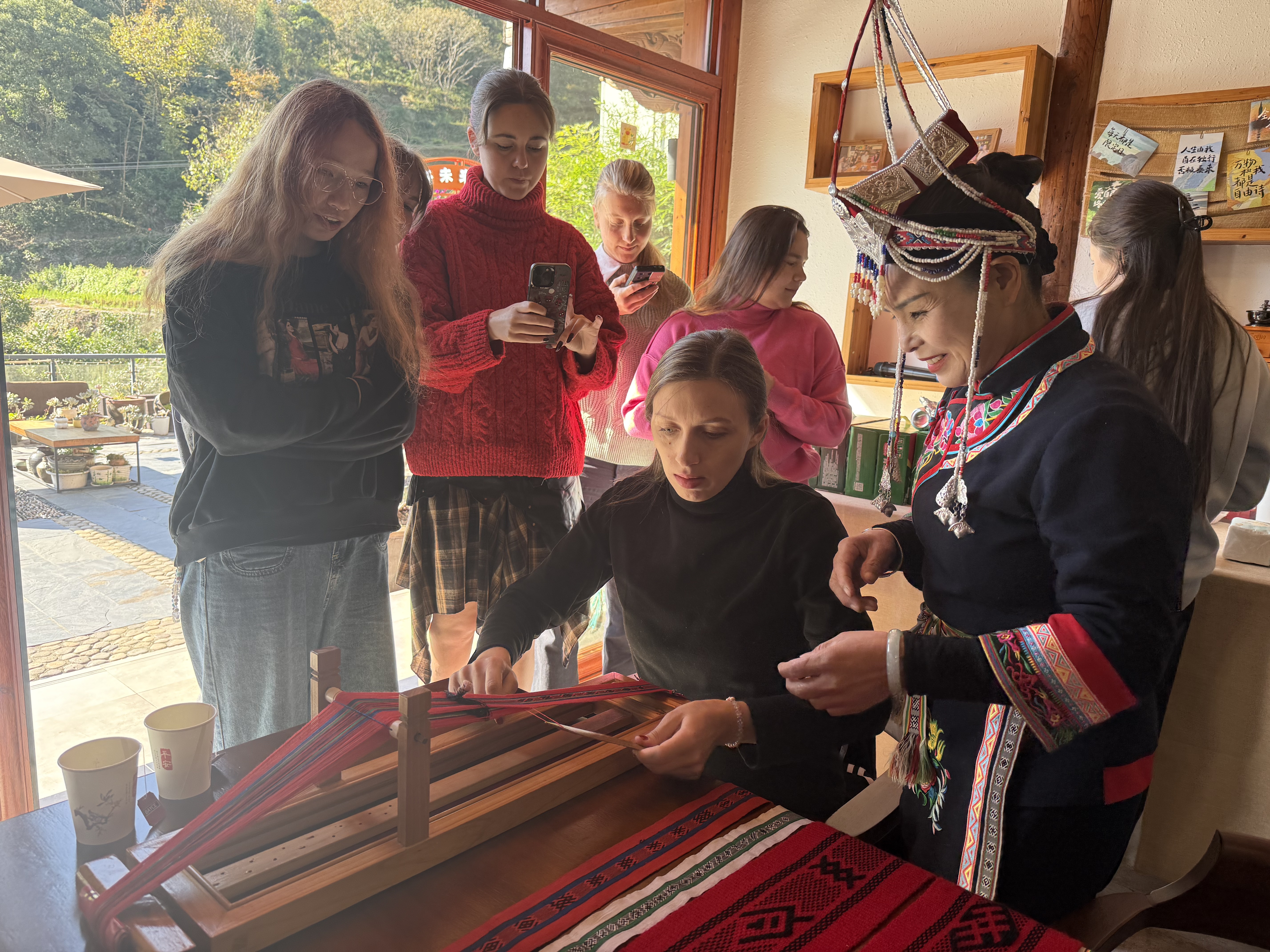 畲族编织是国家级非物质文化遗产,以其精美的图案和独特的工艺闻名。留学生们在非遗传承人的耐心讲解和示范下,体验了彩带编织的乐趣。一根根彩线在指尖穿梭,同学们不仅学习了传统手工艺,更对畲族妇女的智慧与匠心表达了由衷的赞叹。