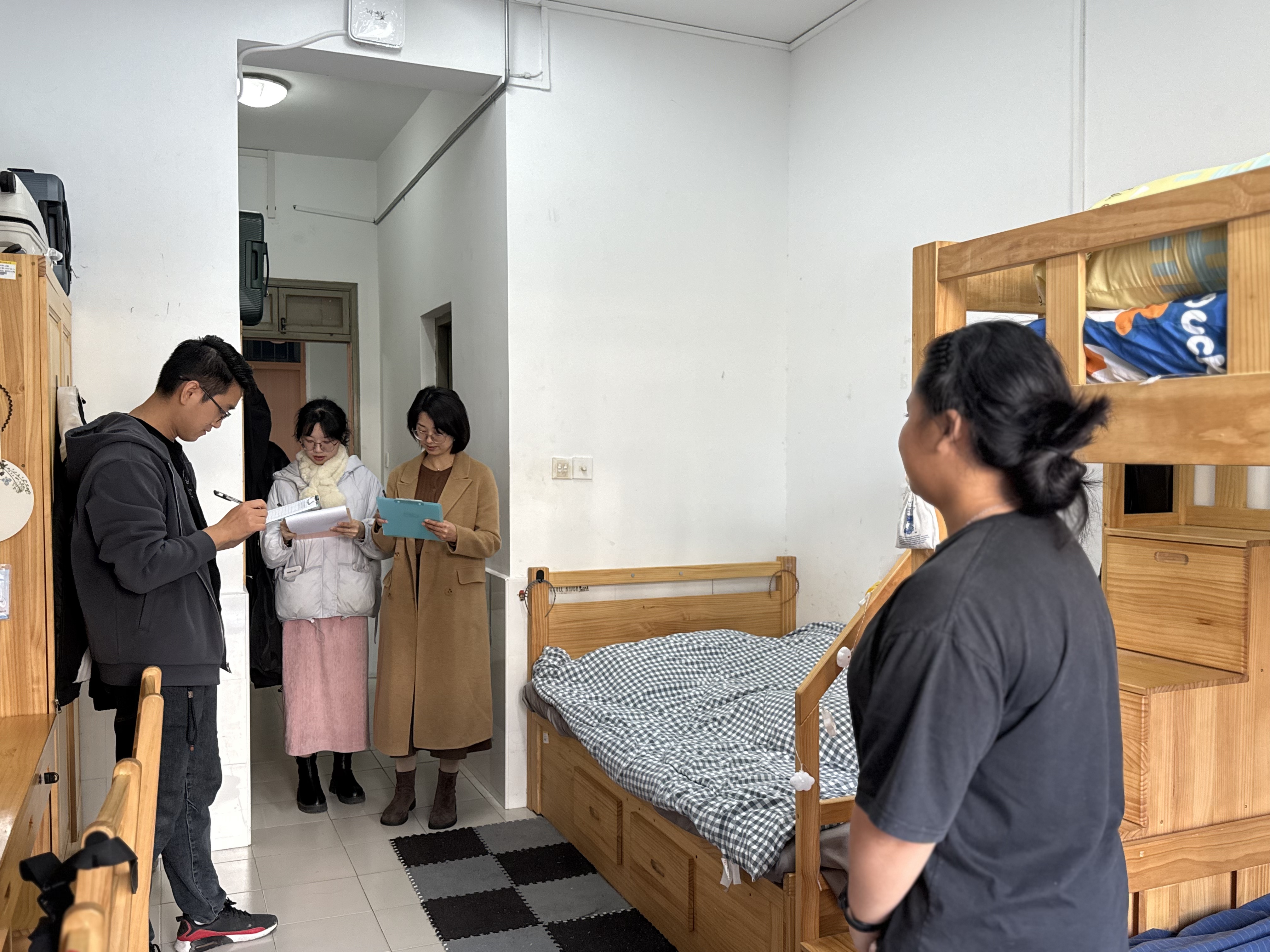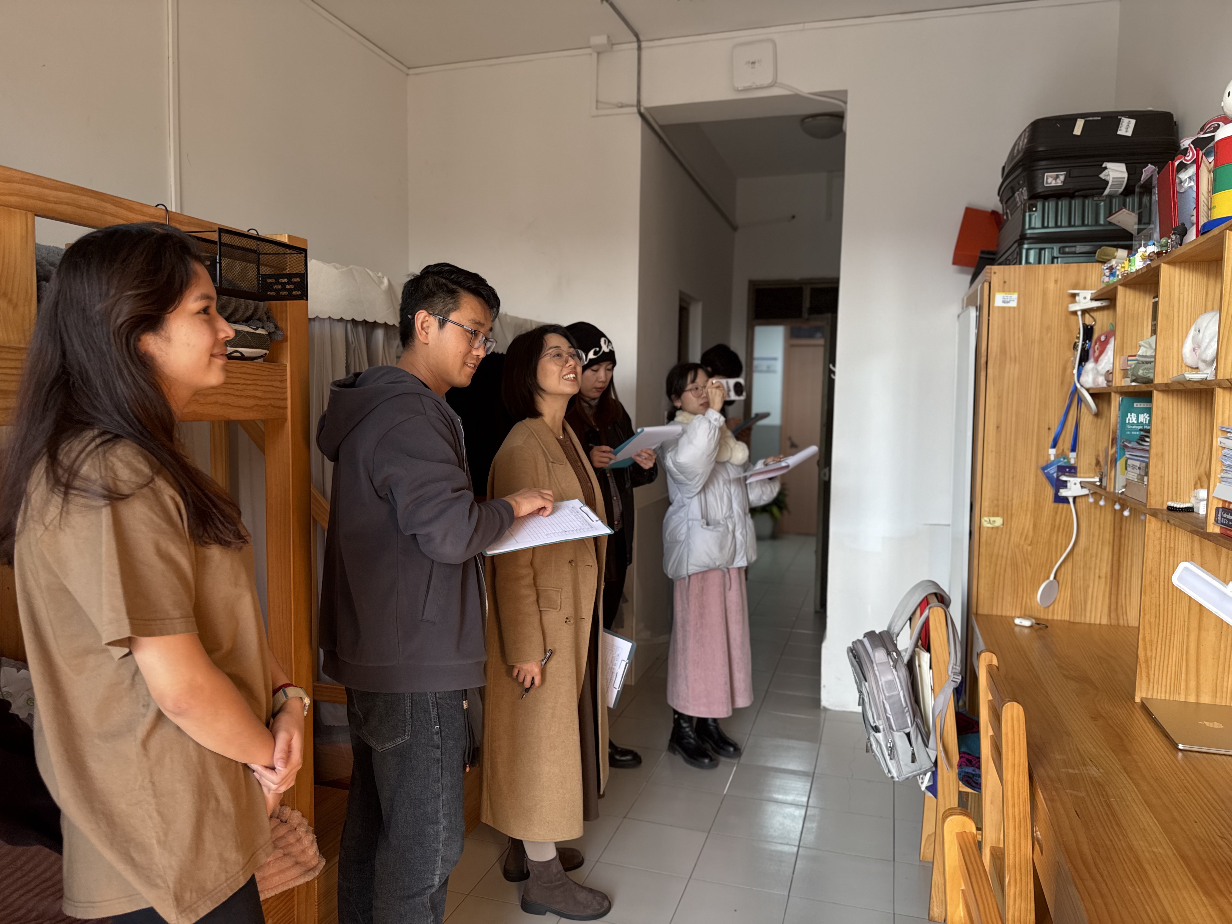 等部门联合组成的评审小组,对入围寝室进行了实地走访与细致考察。评委们严格依据评分标准,从安全规范与纪律守则、整洁有序与日常管理、文化特色与创意设计三大维度进行量化打分。最终评议出16间寝室,荣获“最美寝室”称号。