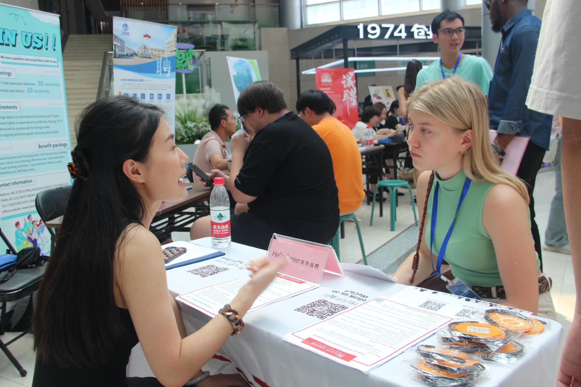 招聘会现场还给留学生们安排了实习与就业政策宣讲会,杭州市公安局钱塘分局的陈雨琦警官围绕“外国留学生在杭创新创业政策”“外国留学就业许可办理流程”等主题,为广大留学生们解读当前最新的就业政策,解答留学生们相关的疑问和困惑。