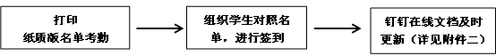 2.利用纸质版名单考勤的老师:可根据纸质版名单原始考勤记录,对照学生名单统计考勤,并在课程考勤名单(钉钉在线文档)中及时更新。