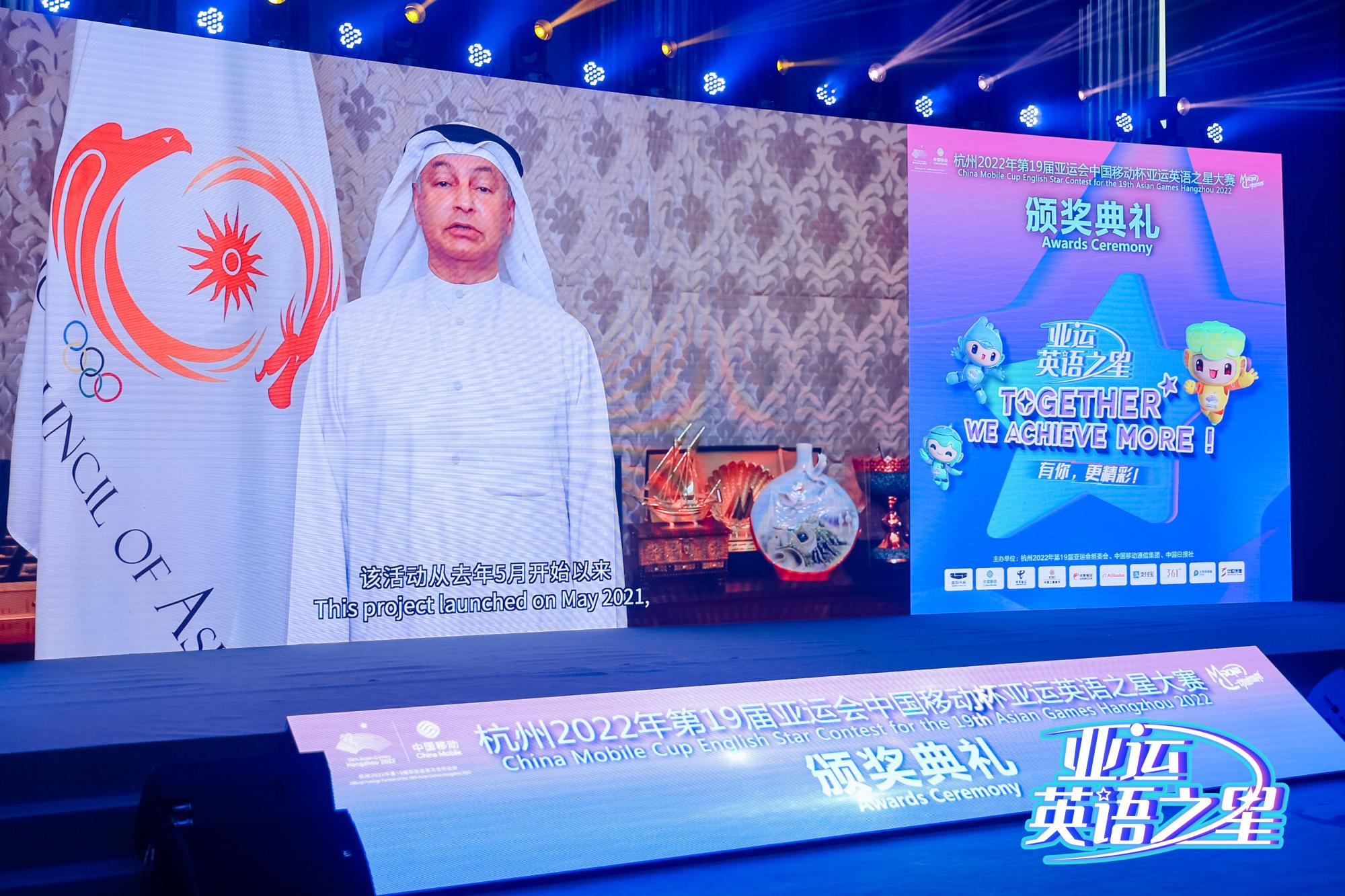 颁奖典礼上,亚奥理事会总干事侯赛因•穆萨拉姆先生通过视频向杭州亚组委表达诚挚问候,祝贺“中国移动杯亚运英语之星”大赛取得圆满成功,向经大赛层层选拔脱颖而出的优秀选手们表示赞赏,欢迎他们参与杭州亚运会,搭起语言交流的桥梁。