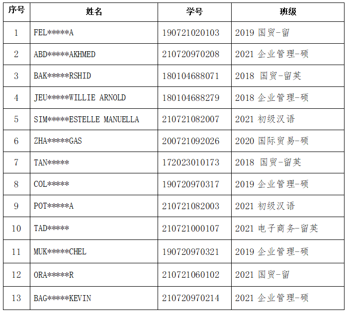 It has been verified that the following 7 international students went to other cities or provinces without approval during the epidemic prevention and control period, concealed and delayed reporting their location, which violated the COVID-19 epidemic prevention and control requirements of Zhejiang University of Finance and Economics and the COVID-19 epidemic prevention and control regulations of School of International Education and Studies during the epidemic prevention and control period. In order to strictly enforce the school discipline and educate all students, the school decided to give these seven students Serious Warning and disqualify them for this academic year's scholarship evaluation.