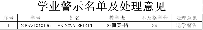学籍管理规定》第三十八条规定,学院决定向AZIZOVA SHIRIN提出退学警告。