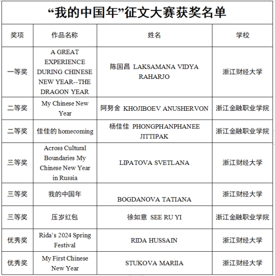 为鼓励来华留学生用立体的影像讲述生动鲜活的中国故事,分享关于浙江经济社会发展、乡村振兴、科技创新、传统文化等方面的见闻与所感;用文字讲述留学生眼中的中国年,我院联合浙江金融职业学院国际交流合作处于2024年寒假期间开展“读懂浙江”中文成人网 微视频大赛和“我的中国年”征文比赛。